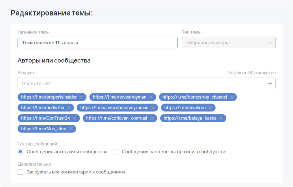 Создаем отдельную тему с высокочастотными запросами, которые нас интересуют. Однако проставляем настройки таким образом, чтобы мониторинг был по определенным каналам.