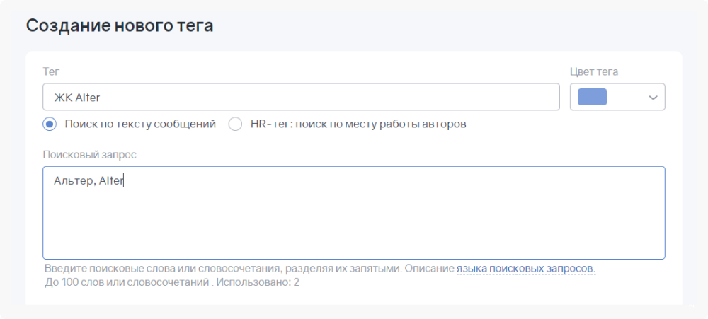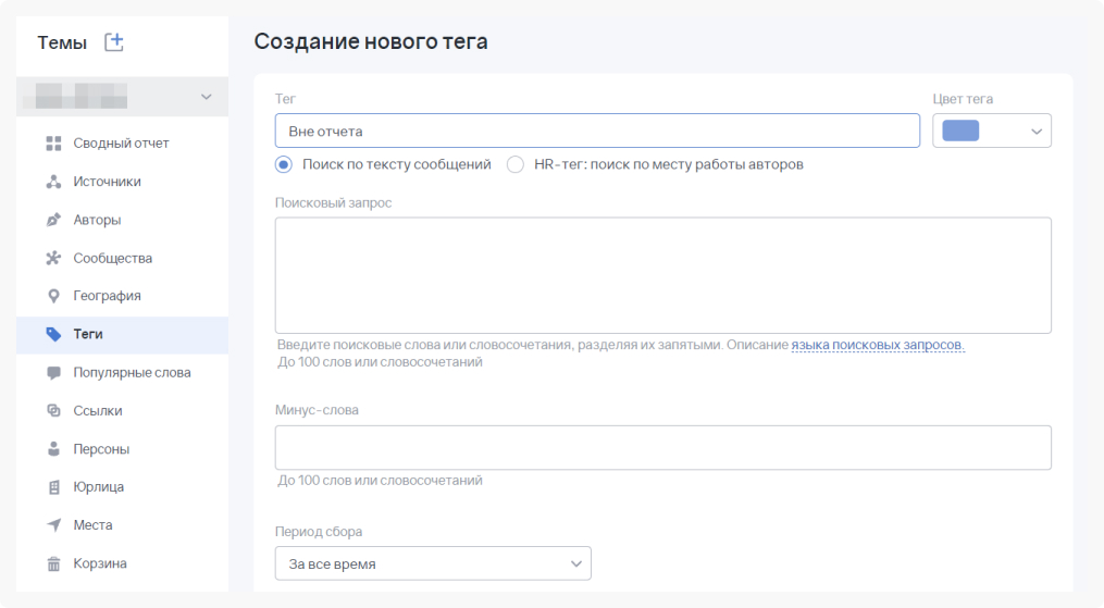 При настройке темы мониторинга используем теги. Они не только упрощают обработку упоминаний, но и помогают корректно собирать отчеты. Например, у нас есть застройщик, а у него 13 ЖК, упоминания по которым необходимо отслеживать. Под каждый ЖК нужно прописать теги во время первой отработки упоминаний.
