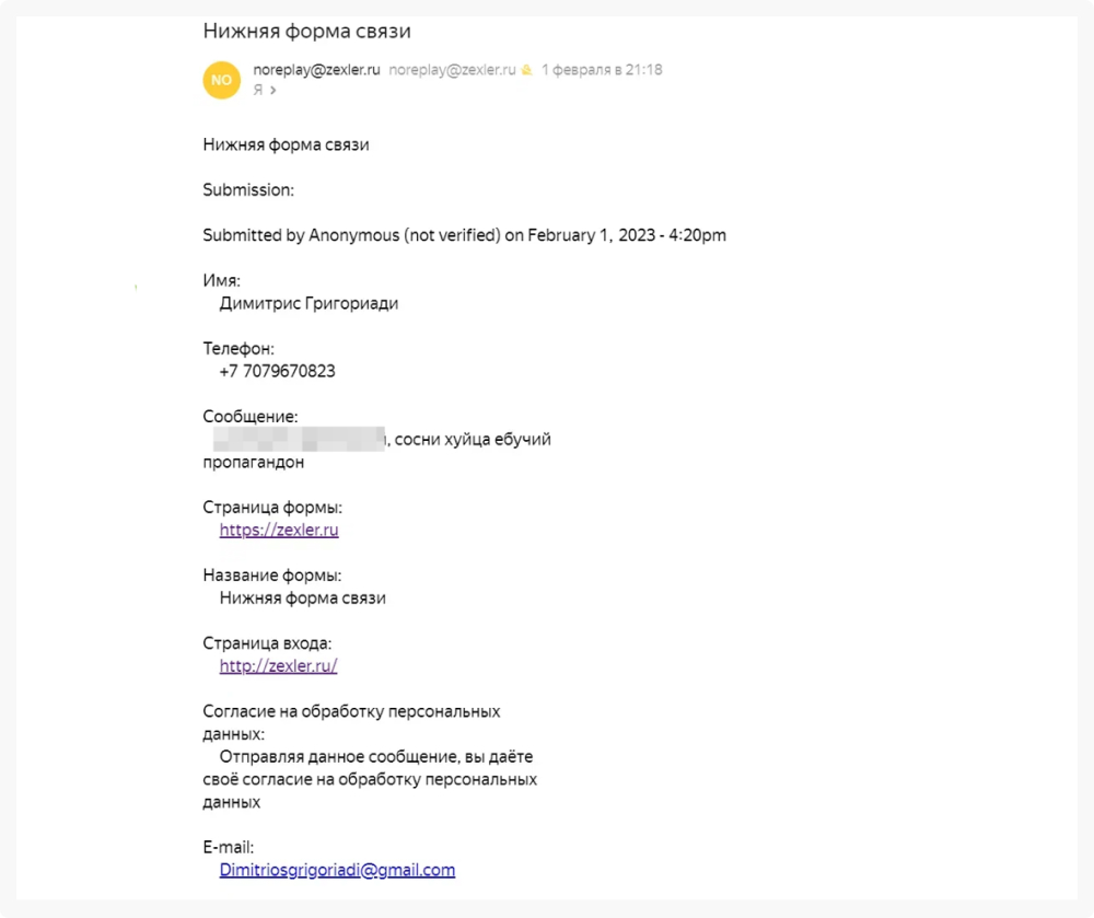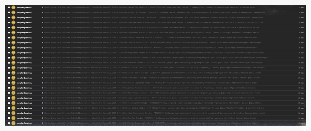 Рандомно подставлялись данные – телефон, имя, почта, а послание до неприличия одинаковое.