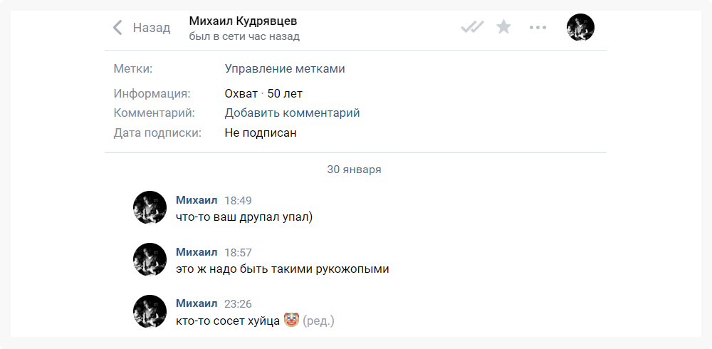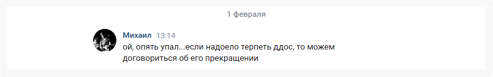 Что же делать? Правильно: забить на всё, пусть поддержка мучается:) Но выходные не вечные и пришлось в понедельник с утра заняться проблемой. Так как уже стало понятно, что это кто-то настойчиво DDOSит. Да и в сообществе ВК некий Михаил, а точнее некто под видом Михаила гадости гадкие начал писать, заявляя так сказать о своём «успехе». А лексика всё та же… Ничего новенького…