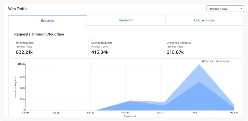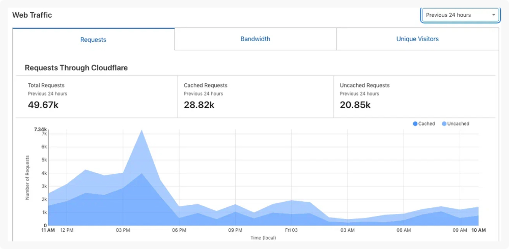 На графике отображён пик атак, и как Cloudflare кэширует запросы..