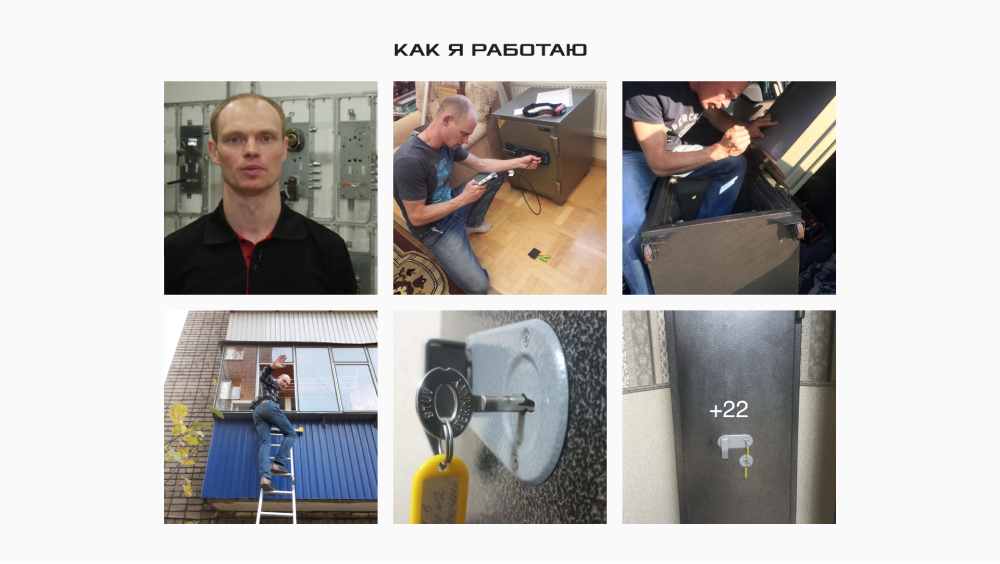 Еще одним важный момент – попросили дать реальные фотографии и самого Павла, и процесса работы. То есть с мастером можно познакомиться уже на сайте. В отдельном блоке есть информация о стаже работ, фото в процессе работы. Такой подход обычно вызывает доверие, а сайт становится не обезличенным.