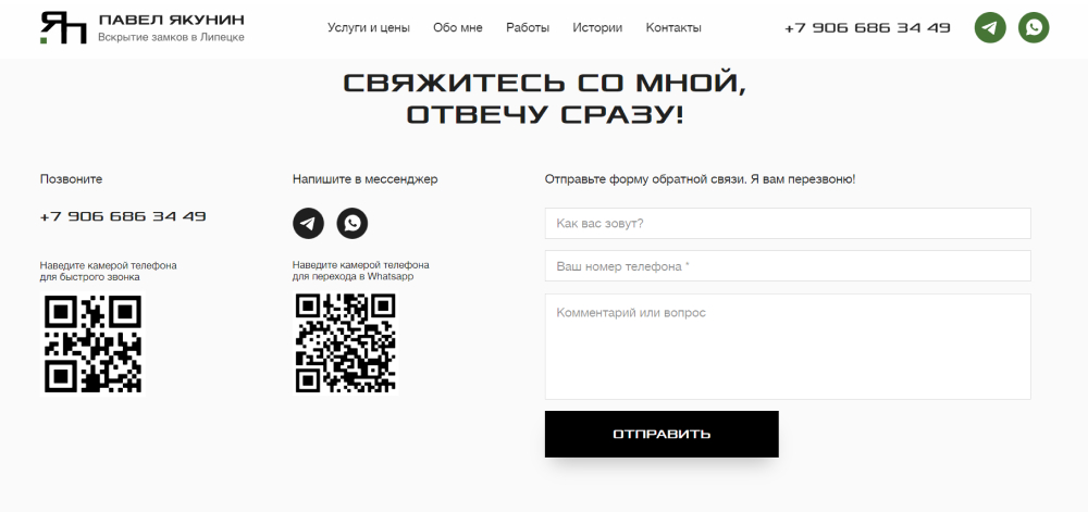 То есть с первого экрана сразу несколько способов как можно скорее связаться с Павлом для решения вопроса вскрытия замка. Для десктопных версий сделали в футере QR–код с возможностью навести на него и позвонить, не набирая номер, а также код с переходами в мессенджеры WhatsApp и Телеграм. Простые ссылки не всегда корректно работают с ПК. Иногда при переходе по ссылкам в мессенджеры открывается браузерная версия, которая не всем удобна, или вовсе переход не срабатывает. Да и для открытия WhatsApp и Telegram на компьютере, не у всех установлены программы этих мессенджеров. Поэтому решили упростить задачу простыми QR–кодами.