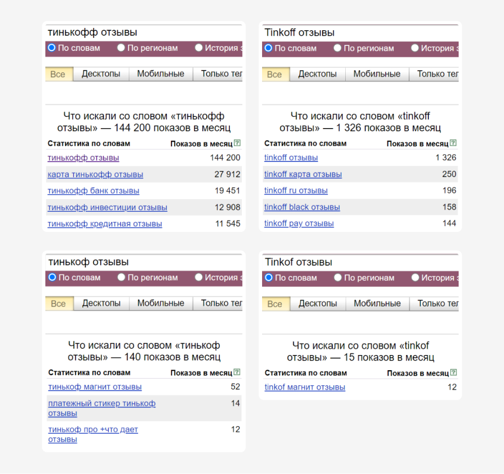 Для уточнения пути клиента, изучаем статистику запросов по компании. Анализируем сколько брендовых и репутационных запросов по компании делают пользователи. Используем все варианты написания запроса. Например: название компании на кириллице, латинице, с типичными ошибками.
