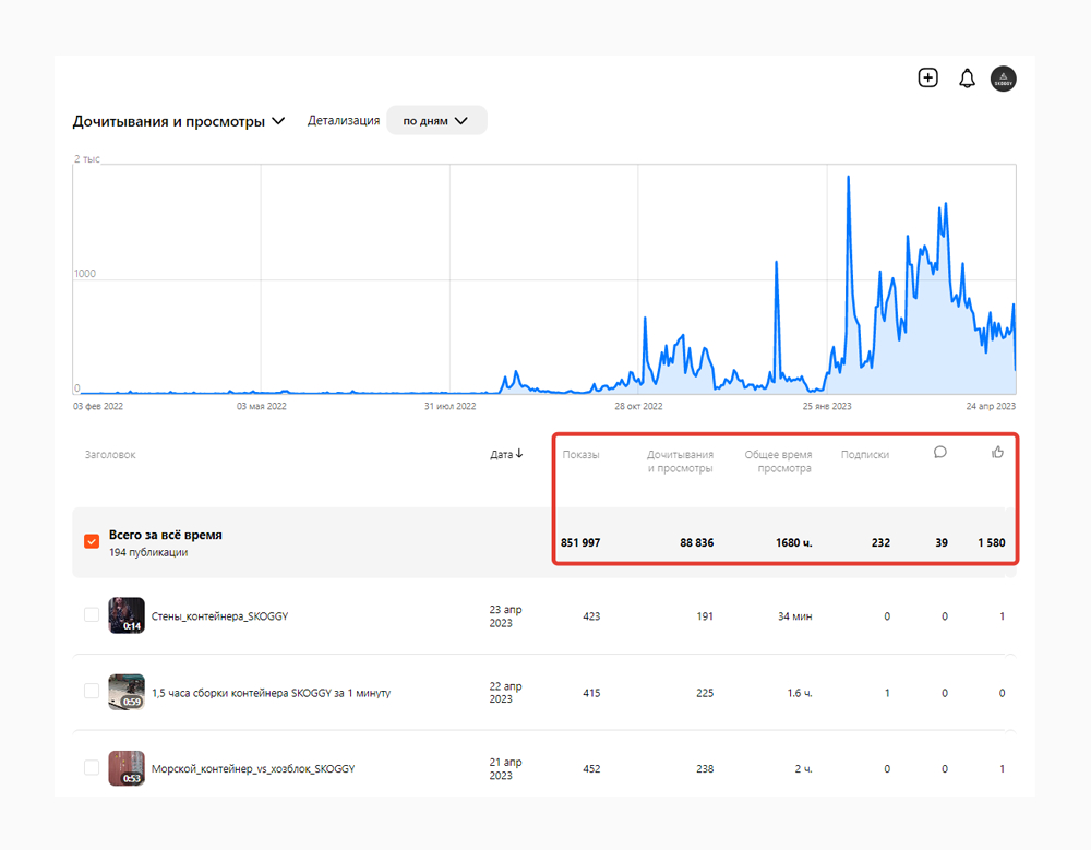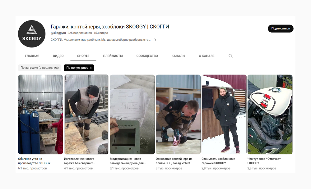 На канал загружали 1-2 видео в неделю. Сфера деятельности и продукт специфический, целевая аудитория – владельцы участков и юр.лица, которым требуется постройка для хранения инструментов, техники, вещей. Вряд ли большое количество людей на Ютубе ежедневно вбивают запросы о покупке хозблока или около того (таких практически нет, мы проверяли). Поэтому нужно было привлекать и побуждать интерес как-то иначе. Делали короткие видео с историями выполненных работ. Это важно. Любой продукт перед покупкой хочется увидеть вживую или хотя бы на видео в естественной среде обитания. Вот и ролики с хозблоками на реальных участках помогали привлекать потенциальных зрителей и покупателей. Все видеокейсы добавляли на сайт, чтобы собирать просмотры через него в том числе.