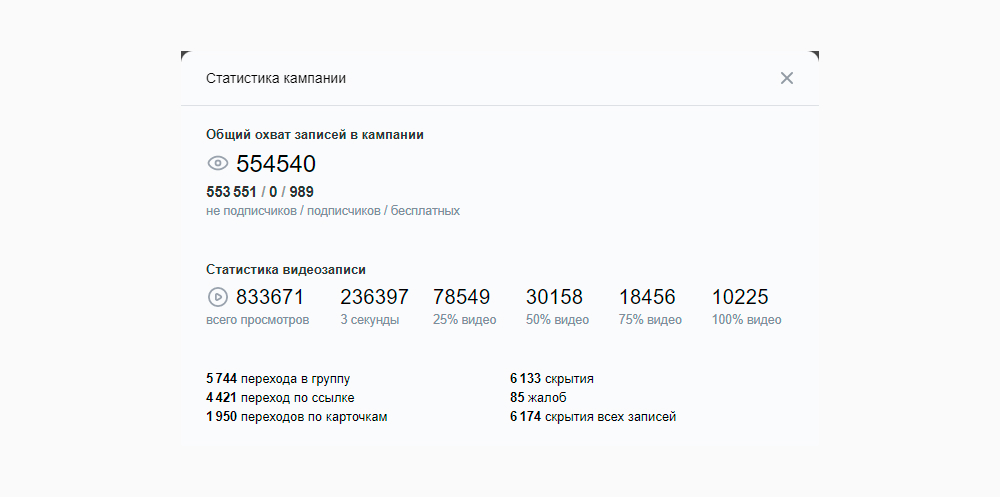 Реклама дала хорошие результаты, подписчики и просмотры начали расти. Общая статистика по всем рекламным кампаниям в VK за тот период выглядела так:
