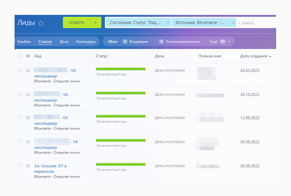 Настроили привязку сообщений из сообщества ВК к CRM, чтобы уведомления о заявках приходили сразу в базу. Там и отвечать сразу удобнее. Вот часть качественных лидов из VK.