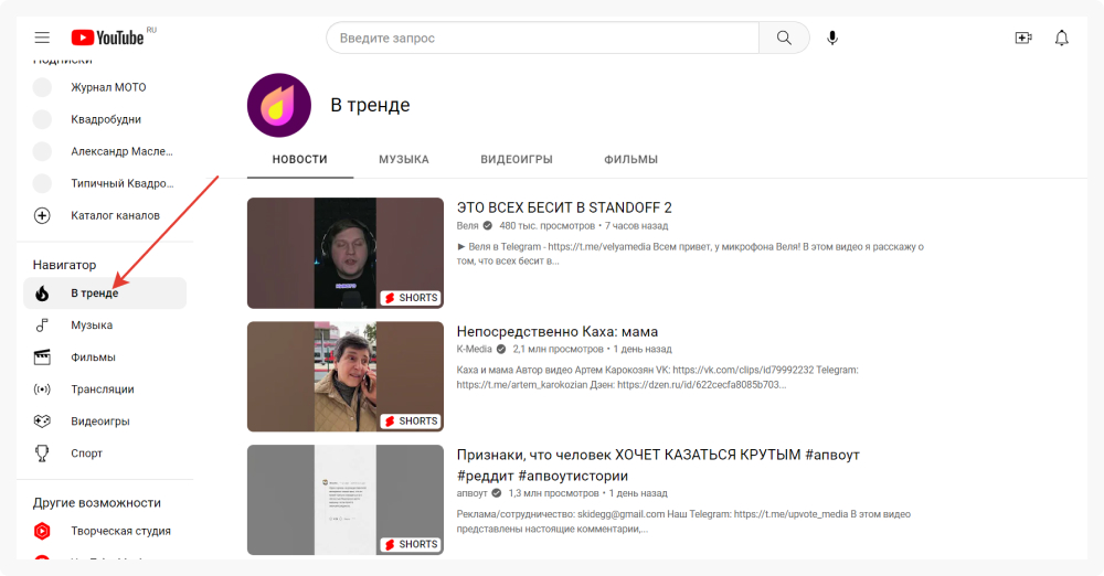 Вбиваем запрос, выбираем желаемый период времени, устанавливаем «Поиск на YouTube», и смотрим результаты.Есть смысл смотреть YouTube тренды. Среди них можно найти что-то вдохновляющее. Обратите внимание, что первые три видео на скриншоте ниже – это Shorts. На них стоит делать особый упор. Именно они при даже небольшом количестве подписчиков дают множество просмотров, помогают каналу расти и вызывать доверие. Да и пользователи потихоньку превращаются в подписчиков, если им действительно нравится контент.