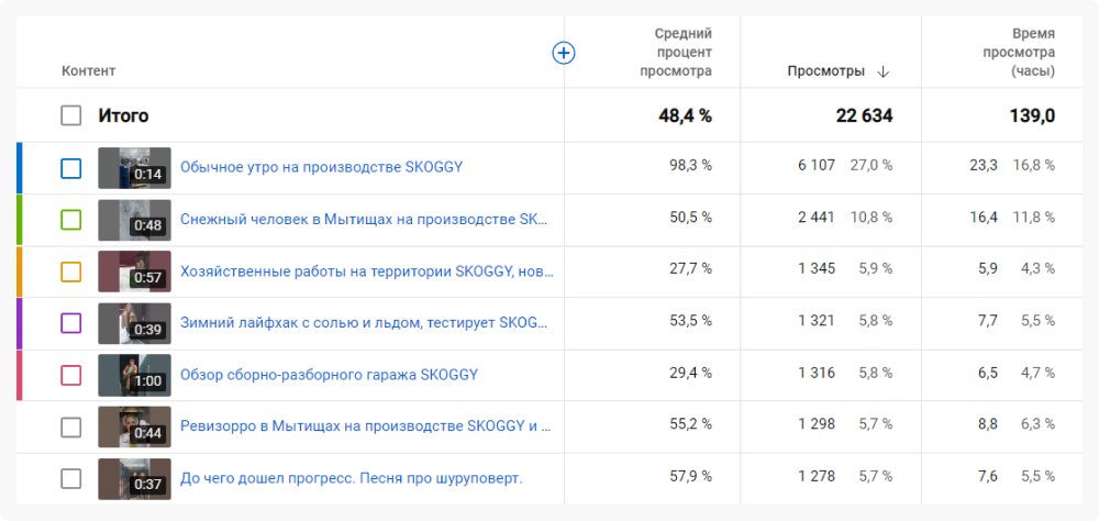 Посмотрите на количество просмотров ролика «Подготовка к сезону...». На видео работа станков и прочие производственные работы, людей практически не видно, основной посыл направлен на работу станков. И вот результат – всего 77 просмотров. А рядом – ролики с живыми объектами. Именно они собрали большое число просмотров практически в первые часы после загрузки.