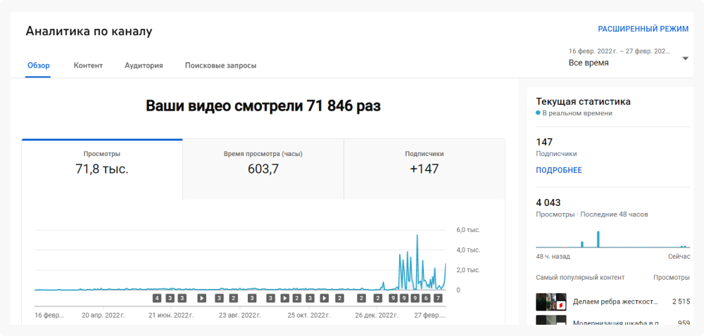 Стало: 71 846 просмотров без накрутки и 147 подписчиков. А больше всего радует, что именно при таком небольшом количестве подписчиков удалось собрать такое большое количество просмотров, учитывая специфичность тематики канала.
