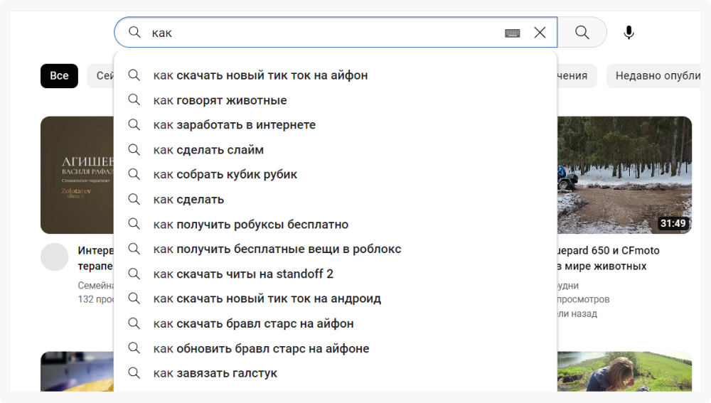Как уже упоминалось ранее, есть смысл создавать ролики под запросы ютубовских пользователей. Самый простой способ узнать, что ищут люди на этой видеоплатформе, начать вбивать слово, вопрос или даже букву.