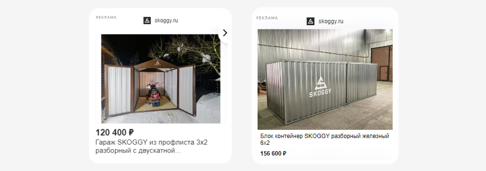 У производителя гаражей и хозблоков SKOGGY накопилось множество вариантов продукции, часто проводятся акции, публикуются выполненные проекты. И всё это уж очень хочется использовать в рекламе. Поэтому, для решения вышеописанных задач мы выстроили следующий рабочий комплекс: