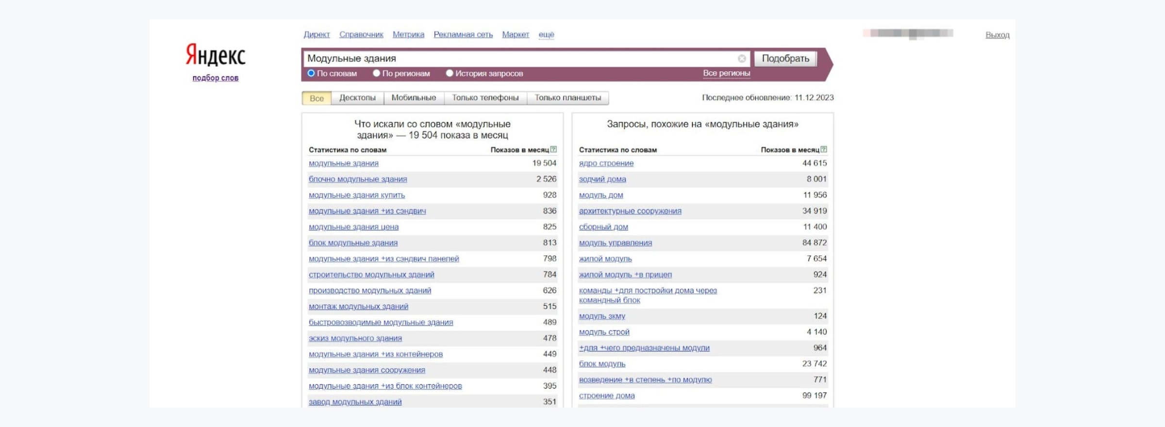 Сбор ключей производился с помощью Яндекс Вордстат. Главной задачей было параллельно со сбором ключевых фраз собирать и список минус слов, так как нужно было исключить показы рекламы физическим лицам. Любые фразы, содержащие в себе дачное, садовое, деревянное и всё, что не относится к тематике продвижения, необходимо было не допустить к показам. Всего собрали 1029 запросов в ядре. Все запросы можно посмотреть здесь.