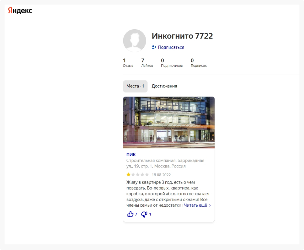 Гипотеза 4 – прокаченность профиля. Тут даже не тестили, а пристально изучили отзывы в ТОП. Обратите внимание на отзыв от “Инкогнито 7722” в скрине выше, смотрим его профиль и понимаем, что прокаченность профиля, если и играет роль, то не в этом случае.