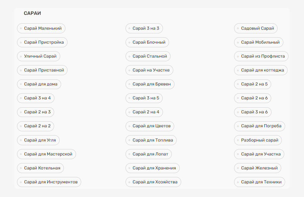 Таким образом мы получили структуру, когда у нас есть основные категории: гаражи, хозблоки и блок контейнеры, а все входящие в них запросы распределены между основными подкатегориями и страницы с тегами.