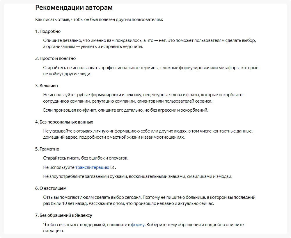 Администрация Яндекс.Карты предпочитает, чтобы отзыв был написан подробно и обязательно с описанием личного опыта. У площадки довольно строгие требования к содержанию отзыва. Ниже скриншот нескольких правил.