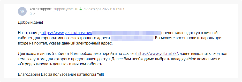 Отправьте запрос на предоставление доступа к карточке компании на электронную почту support@yell.ru. В письме укажите ссылку на вашу компанию на данном сайте. Через несколько дней вы получите ответ о том, что вам предоставлен доступ в личный кабинет для вашего корпоративного электронного адреса примерно в таком формате: