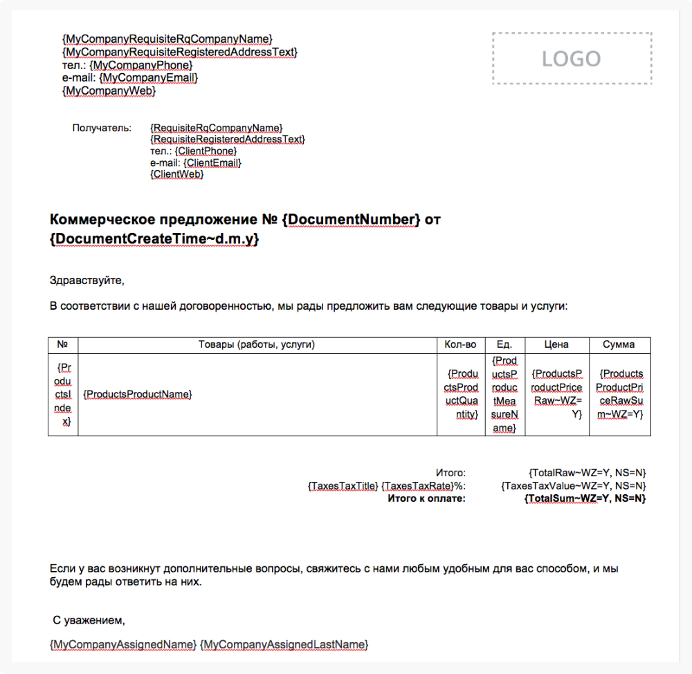 Для наших клиентов стандартная форма КП не подошла и на практике не принесла особой пользы. Как выяснилось, все документы в CRM состоят из шорт кодов, которые необходимо расположить в нужном порядке. Если вдруг каких-то кодов нет, то можно их добавить. Переведем шаблон из примера выше на подобный лад.