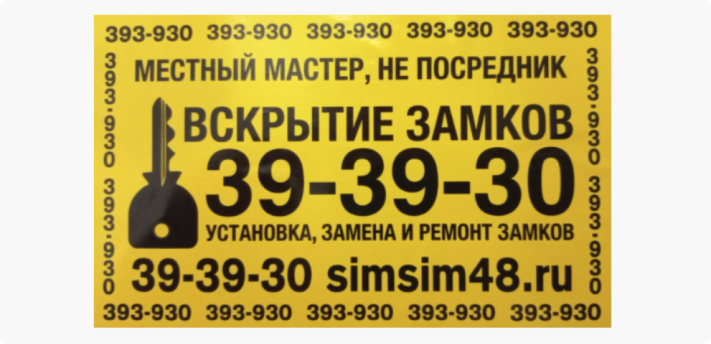 Вернемся к нашему мастеру Павлу. Изначально основной поток заявок идет и шел через простые объявления, которые с некоторой периодичностью расклеиваются по всему городу (столбы, подъезды, лифты, парковки) и принты, чтобы быть на виду (немножко вандальный способ, но что тут поделаешь). Но процесс поддержания видимости своей рекламы в формате оффлайн весьма проблематичен из-за высокой конкуренции (а сетевики не только скликивают рекламу в интернете (ой, спойлер), но ещё и закрашивают и срывают физические объявления), поэтому дополнительные показы и в онлайне были бы отличным вариантом для расширения своего присутствия. Так как первое, где будет искать человек, как открыть запертую дверь, это телефон.