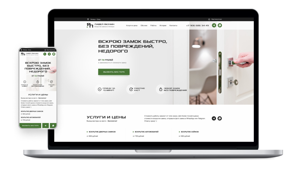 Что касается общего дизайна сайта. Он делался по принципу Mobile first. То есть в первую очередь думали об удобстве использования с мобильных телефонов. Потом уже продумали десктопную версию. При создании мобильной адаптации упор делали на то, чтобы вся необходимая информация была наверху. А это: контакты, сроки (мастер работает круглосуточно, приезд в течение 15 минут или в любое удобное время), цена в фомате «от», чтобы не было сюрпризов после проделанной работы, и информация о том, что Павел открывает замки без повреждения.
