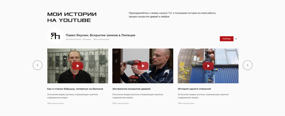 Спросили у Павла, были ли какие-то интересные истории в его работе, и оказалось, что их немало. Попросили снять видео с рассказами. Завели YouTube-канал, залили все ролики и вывели на сайте виджет с Ютуба. То есть любой посетитель сайта кроме фотографий может посмотреть на мастера на видео, а также послушать удивительные истории спасения.