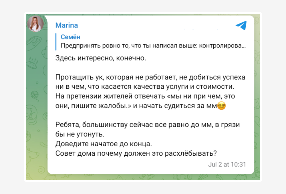 Часто информация, которую обсуждают состоявшиеся клиенты в чатах, разительно отличается от той, которая выплескивается в ТОП. С другой стороны, если напряжение состоявшихся клиентов в чатах нарастает, есть шанс получить цунами негатива в общем доступе. Именно поэтому при изучении ситуации потенциального клиента мы оцениваем репутационные риски, которые транслируются в чатах состоявшихся клиентов.