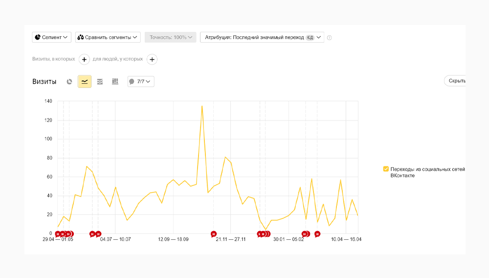 А вообще соцсети, и ВКонтакте в том числе, дают хороший трафик на сайт. В постах оставляем ссылки на статьи в блоге, кейсы, товары. И люди интересуются и переходят. Ниже график из метрики по переходам на сайт SKOGGY именно из VK.