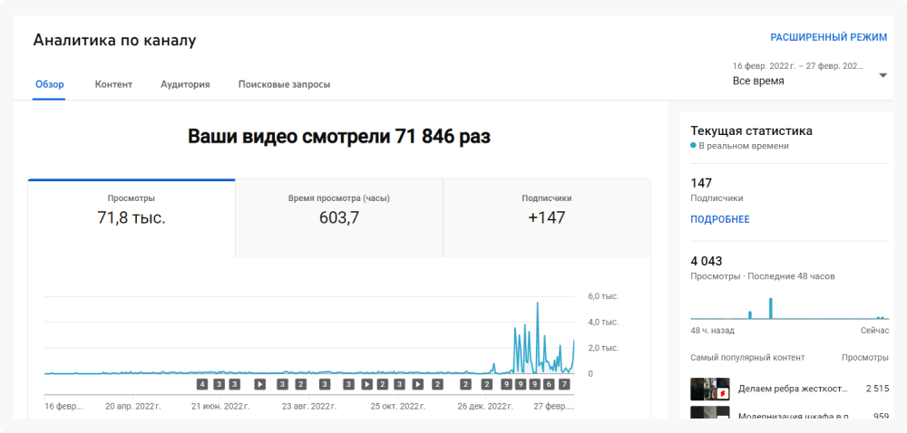 Пару месяцев назад делали статью по YouTube-каналу, где показатели были вот такими: