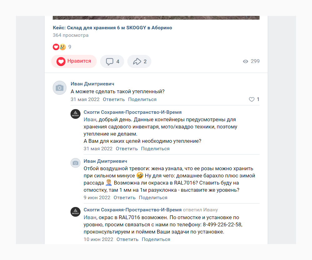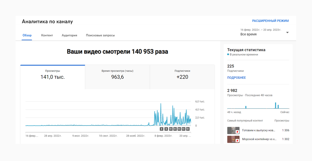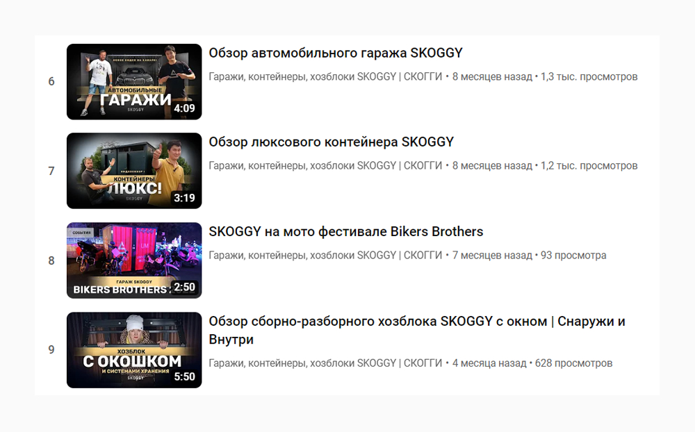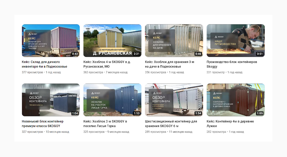 На канал загружали 1-2 видео в неделю. Сфера деятельности и продукт специфический, целевая аудитория – владельцы участков и юр.лица, которым требуется постройка для хранения инструментов, техники, вещей. Вряд ли большое количество людей на Ютубе ежедневно вбивают запросы о покупке хозблока или около того (таких практически нет, мы проверяли). Поэтому нужно было привлекать и побуждать интерес как-то иначе. Делали короткие видео с историями выполненных работ. Это важно. Любой продукт перед покупкой хочется увидеть вживую или хотя бы на видео в естественной среде обитания. Вот и ролики с хозблоками на реальных участках помогали привлекать потенциальных зрителей и покупателей. Все видеокейсы добавляли на сайт, чтобы собирать просмотры через него в том числе.