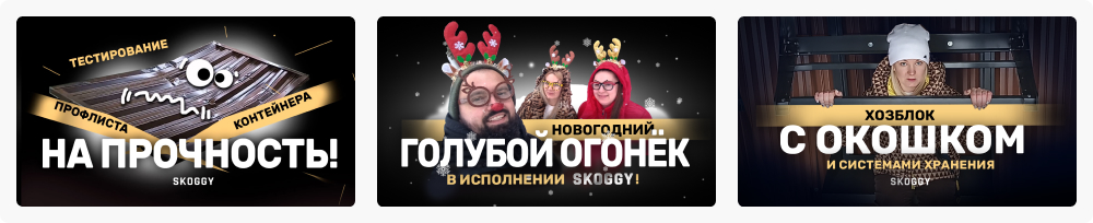 Мы для видео своего клиента SKOGGY обязательно к картинкам-заставкам привлекаем дизайнера. На обложке по возможности размещаем героев ролика. Если ключевая роль выпала неодушевлённому профлисту, оживляем профлист, добавляем лаконичные надписи – и привлекательная превьюшка готова.