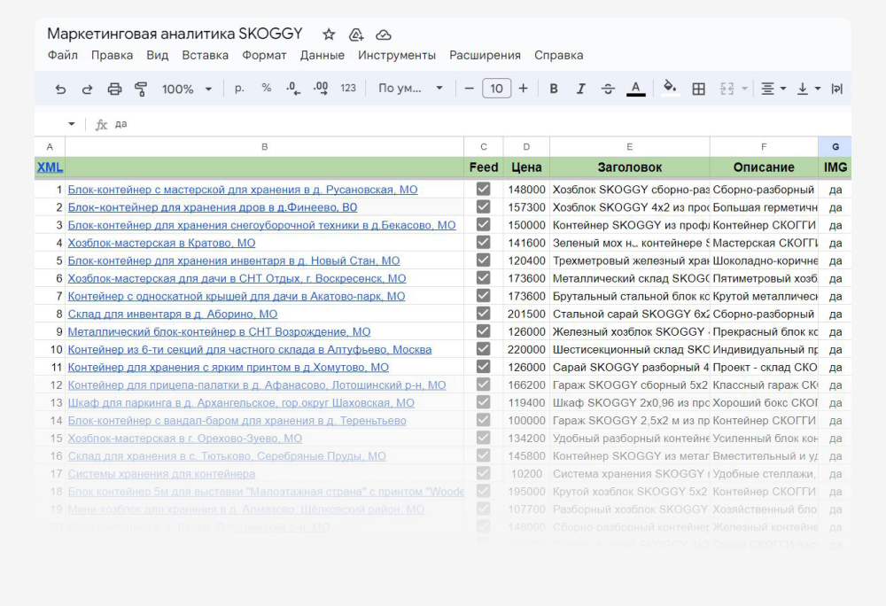 Ниже прописывается цена. Далее – заголовок и описание. На начальном этапе обозначили критерии, которые необходимо учитывать при написании заголовка и описательной части. В первую очередь, это важные свойства блок-контейнеров (сборно-разборные, металлические), название продукта (хозблок, гараж, сарай, блок контейнер и т.д.), размер и, конечно же, бренд. Для удобства набросали возможные варианты (эпитеты, синонимы), чтобы разнообразить рекламные смарт-объявления.