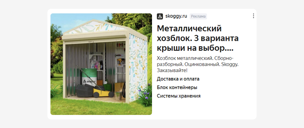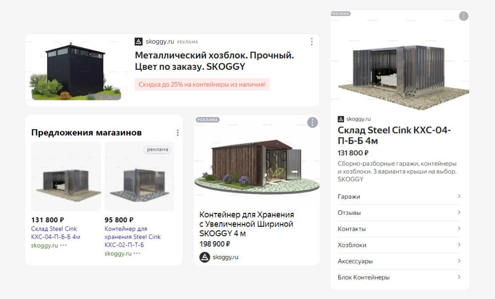 У производителя гаражей и хозблоков SKOGGY накопилось множество вариантов продукции, часто проводятся акции, публикуются выполненные проекты. И всё это уж очень хочется использовать в рекламе. Поэтому, для решения вышеописанных задач мы выстроили следующий рабочий комплекс: