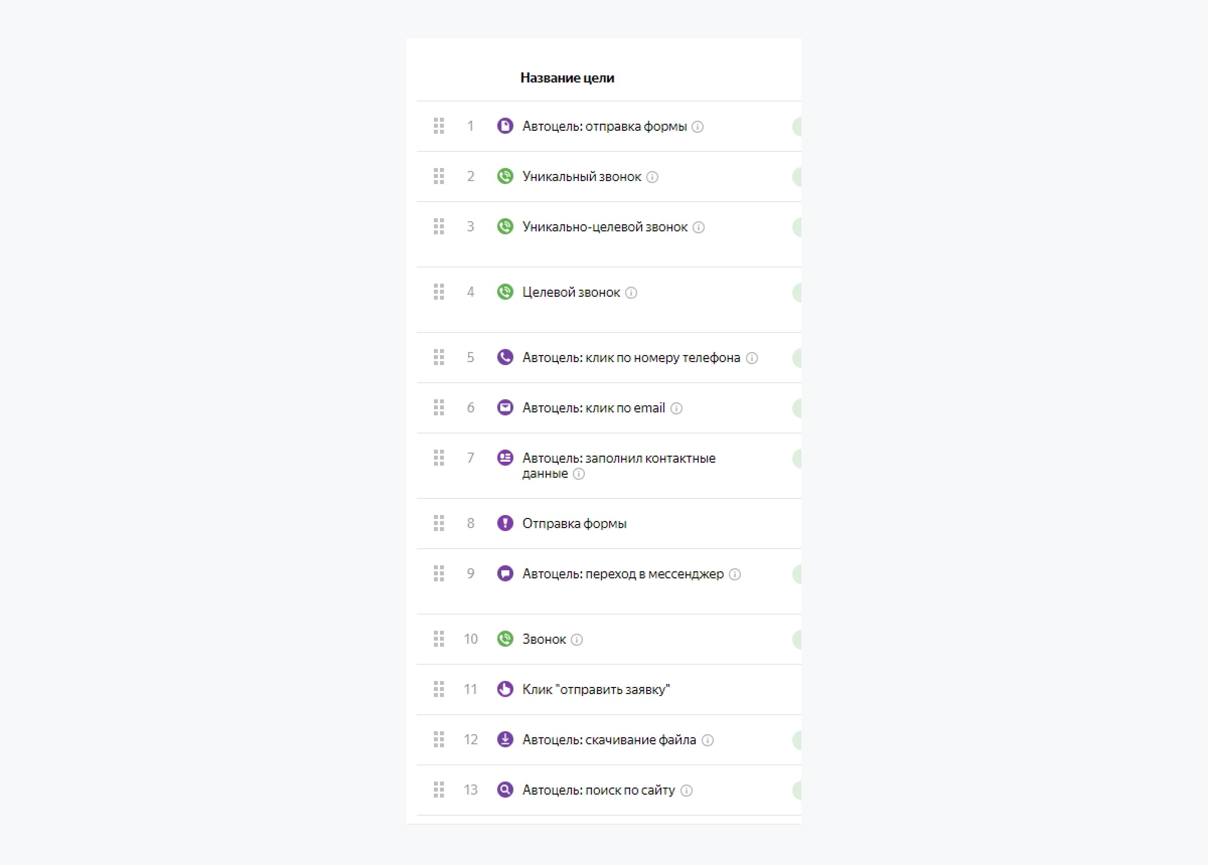 Автоцели были созданы автоматически метрикой при совершении действий на сайте. В данном случае это открытие любой формы на сайте, клик по номеру, email, клик на мессенджер, скачивание любого файла с сайта, поиск по сайту и заполнение контактных данных.