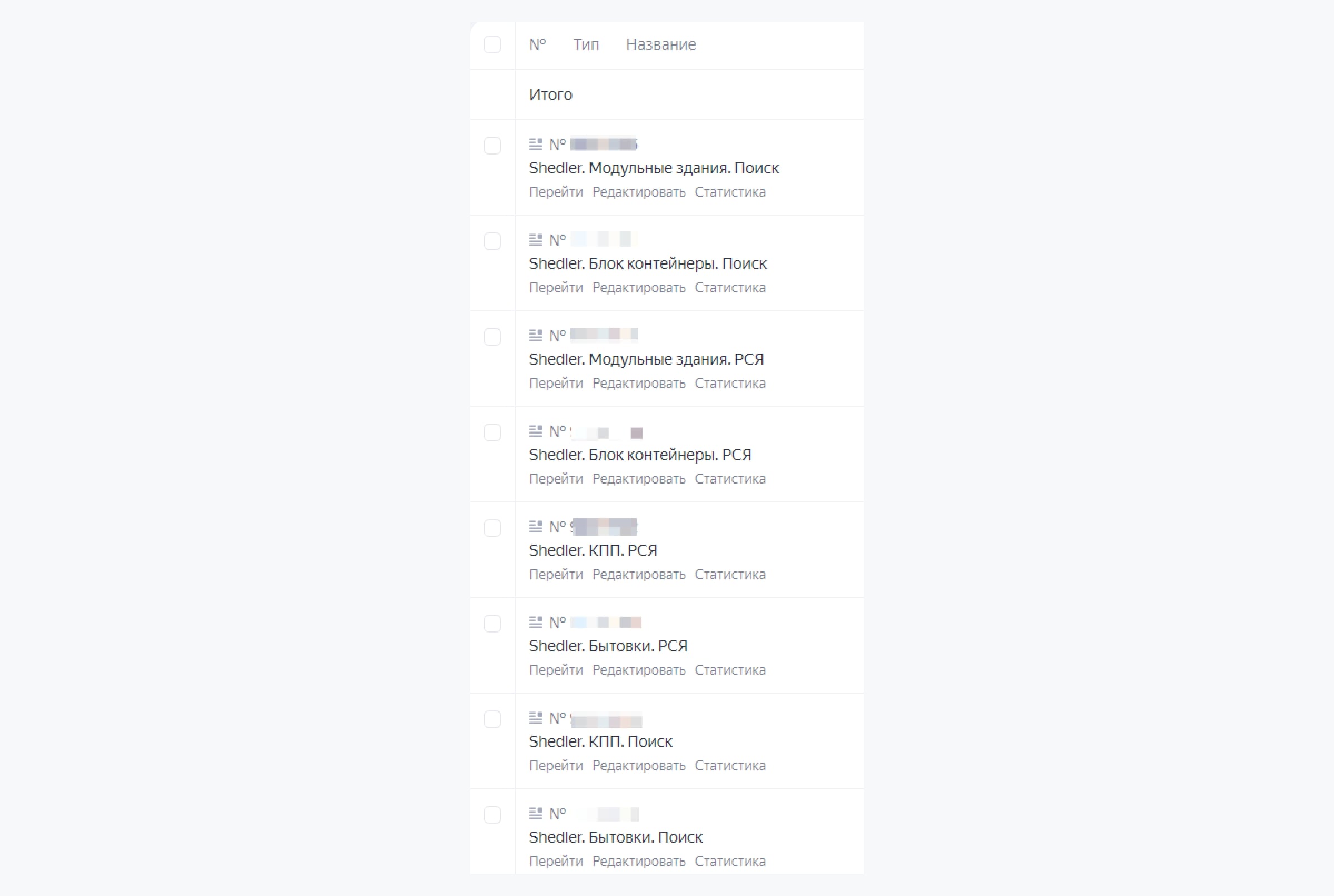 Рекламные кампании были разделены на основные направления сайта, и под каждое из них настроили показы на Поиск и отдельно РСЯ. 8 основных рекламных кампаний: