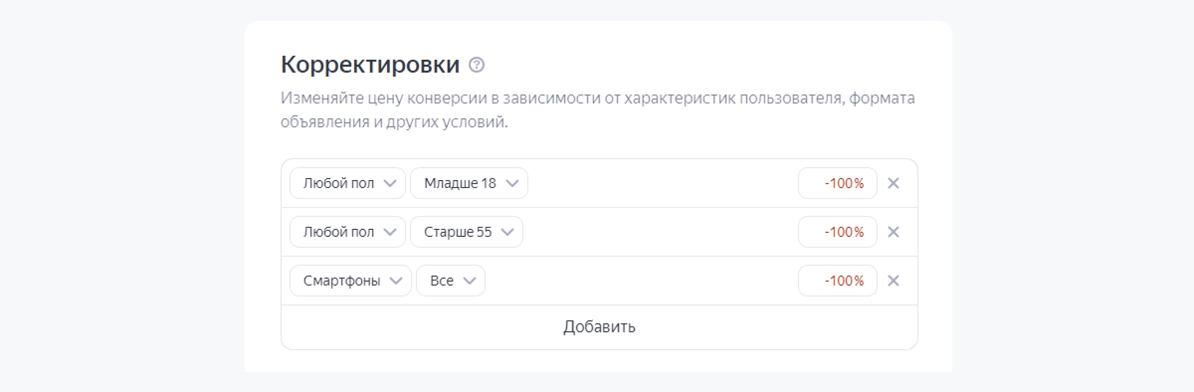 Так как реклама в основном ориентирована на юридических лиц, в настройках кампании были добавлены корректировки по полу, возрасту и устройствам.