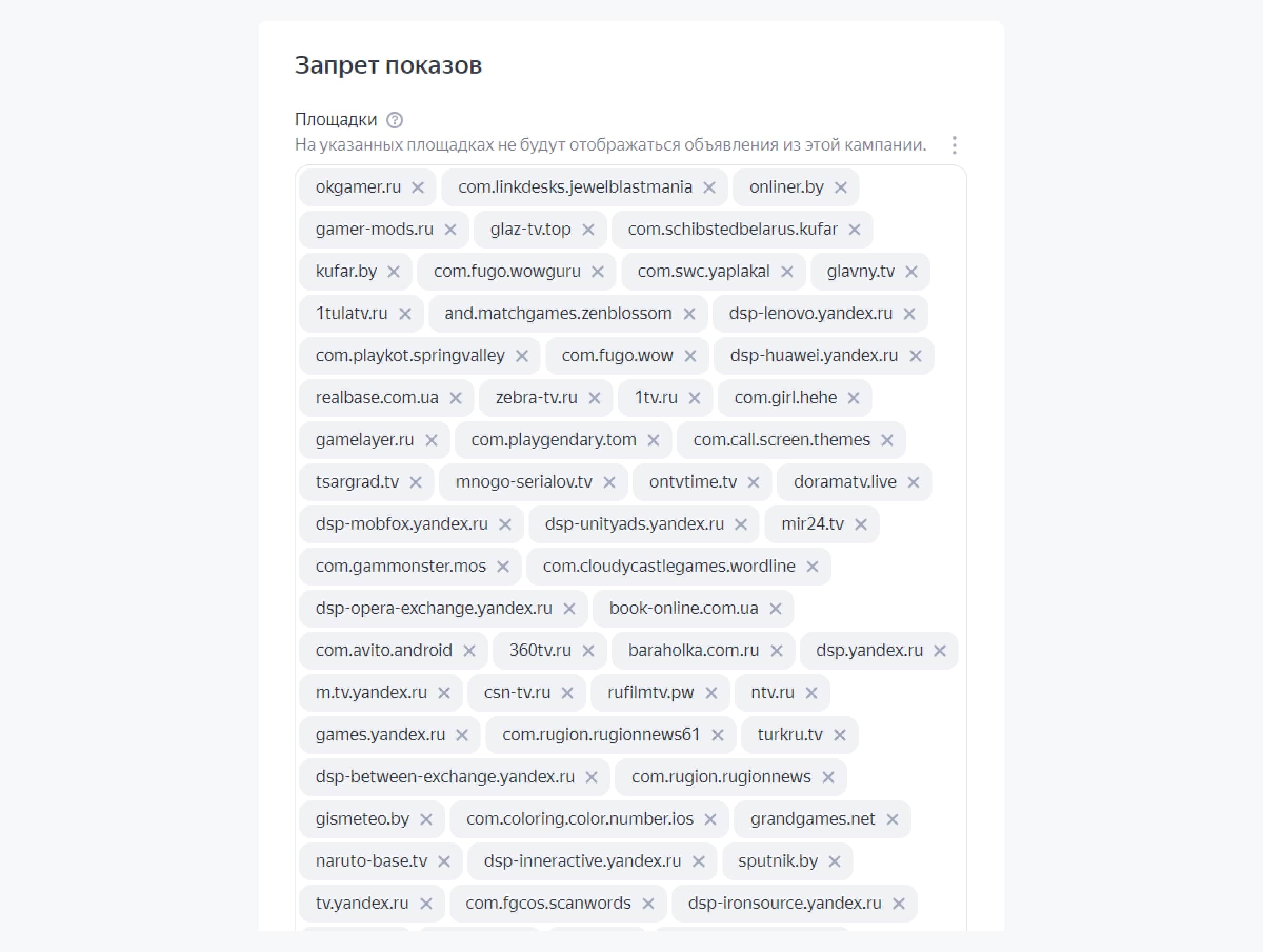 Немаловажным в рекламных кампаниях, ориентированных на показы в рекламной сети яндекса (РСЯ), является запрет площадок, такие как игровые, онлайн-тв, новости, приложения для смартфонов и другие. Они будут приводить много мусора и тратить деньги, поэтому от таких площадок избавились. Всего запрещенных площадок для SHEDLER в РСЯ более 600.