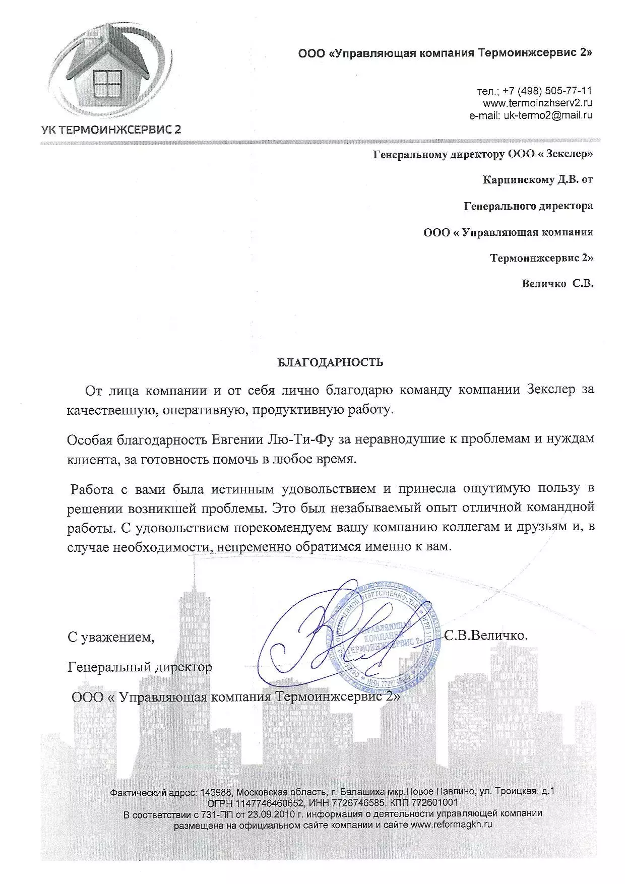 С уважением,Генеральный директорООО « Управляющая компания Термоинжсервис2» С.В. Величко